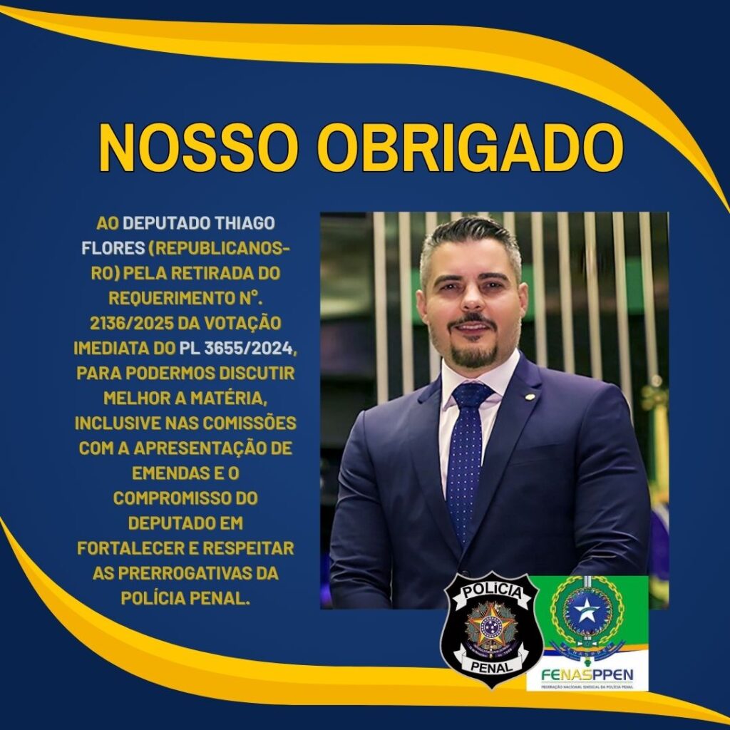 Agradecimento ao Deputado Thiago Flores pela retirada do requerimento de votação imediata do PL 3655/2024 que invade competências exclusivas da Polícia Penal