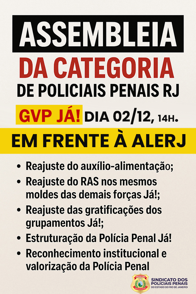(21) 2532-0207 contato@sindsistema.org.br Av. Treze de Maio, n°. 13 – sala 709 – Cinelândia, Rio de Janeiro O presidente do Sindicato dos Policiais Penais RJ reitera a CONVOCAÇÃO da categoria para estarmos juntos na Assembleia que será realizada na terça-feira (02/12/25), às 14 horas, em frente à Alerj. Será disponibilizado #ônibus com saída às 12 horas do […]