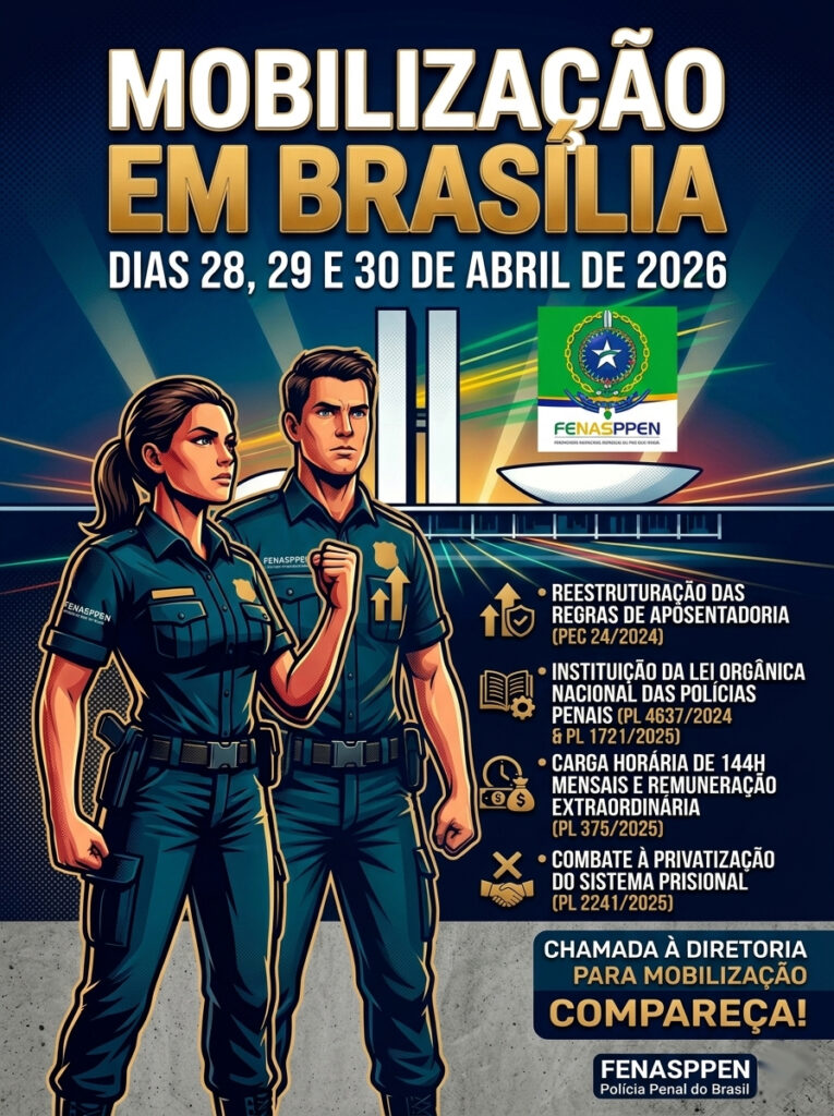 O presidente da FENASPPEN, Fernando Anunciação, convoca a diretoria da Federação Nacional para uma missão estratégica em Brasília, entre os dias 28 e 30 de abril, com foco na consolidação da Lei Orgânica Nacional das Polícias Penais (PL 4637/2024 e PL 1721/2025).