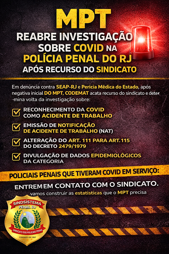 As informações coletadas servirão para subsidiar estatisticamente a investigação do MPT, contribuindo para demonstrar o impacto da pandemia sobre os trabalhadores do sistema prisional. Para o Sindicato, a reabertura do procedimento representa um passo importante na defesa da saúde ocupacional dos policiais penais.