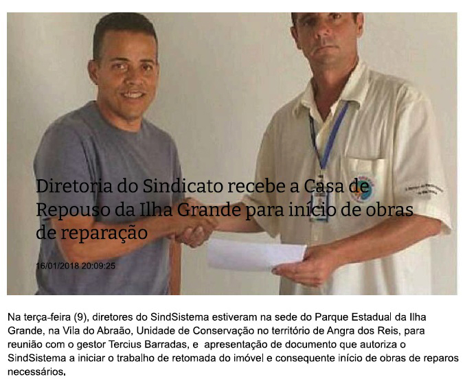 Em 03/01/2018, o então presidente do INEA, Marcus de Almeida Lima, autorizou a retomada da Casa de Repouso aos policiais penais. À época, o gestor do Parque Estadual da Ilha Grande, Tercius Barradas, elogiou a diplomacia adotada pela gestão do SindSistema Penal RJ, nas tratativas. Recentemente, o presidente do Sindicato dos Policiais Penais RJ, Gutembergue de Oliveira, realizou reuniões com o atual presidente do Instituto Estadual do Ambiente (INEA), Renato Jordão Bussiere, com intermediação dos policiais penais Jefferson, Vereador Fernando Armelau, e do Deputado Jorge Felipe Neto. No sentido de manter o imóvel na utilização dos policiais penais, em cumprimento do papel para o qual o Sindicato há anos tem investido, tanto na manutenção quanto na valorização do local. Em continuidade à articulação política, o presidente do Sindicato dos policiais penais, Gutembergue de Oliveira, esteve nessa sexta-feira (27/06) com a Secretária de Estado de Administração Penitenciária, Maria Rosa Lo Duca Nebel para reforçar a articulação política, já que se trata de matéria de competência da SEAP. O Sindicato está perfazendo o mesmo caminho feito na gestão do coronel PM Erir Ribeiro.