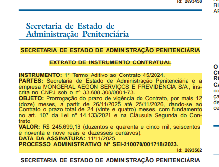 O contrato celebrado entre a SEAP e a empresa Mongeral Aegon Serviços e Previdência S/A trata da prestação de serviços de Seguro de Vida, mediante a implantação de apólice específica para servidores ativos – Inspetores de Polícia Penal RJ.