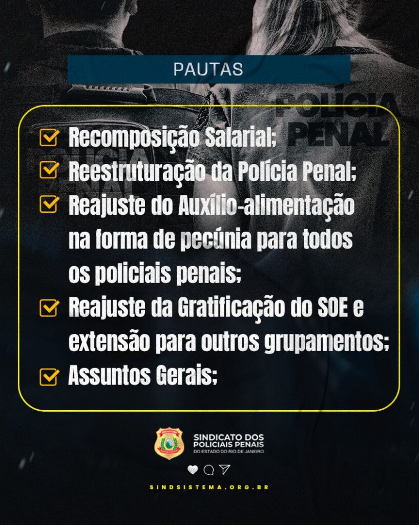 Recomposição salarial; Estruturação da Polícia Penal; Reajuste do auxílio-alimentação, com defesa da concessão em pecúnia para todos os Policiais Penais; Reajuste da Gratificação do SOE e extensão para outros grupamentos; Assuntos gerais de interesse da categoria.