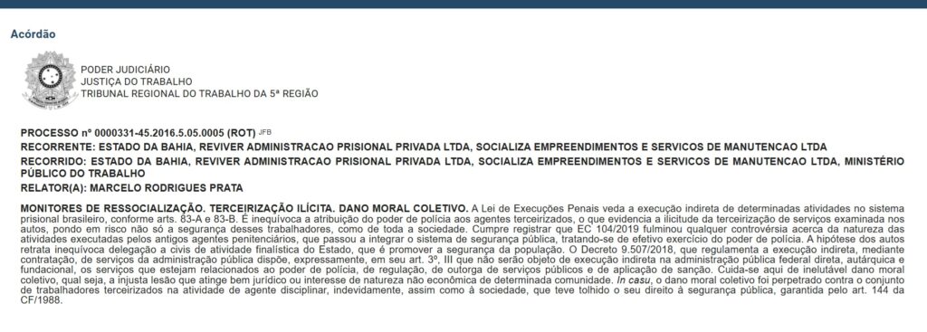 Em qualquer caso, o acórdão do TRT-5 já integra o corpus jurisprudencial que sustenta a tese de que o sistema prisional deve ser operado por servidores públicos de carreira, qualificados e responsáveis perante o Estado — e não por empresas privadas cujo foco primordial é a lógica contratual.